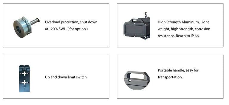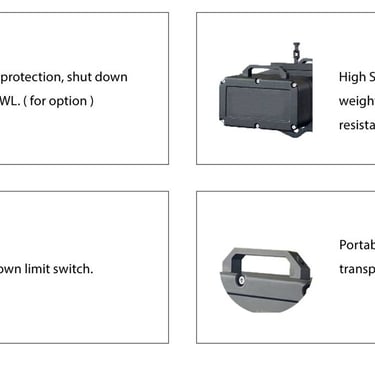 Modular Safety Features - Up/down limit switches, load monitoring, emergency stopper (optional).